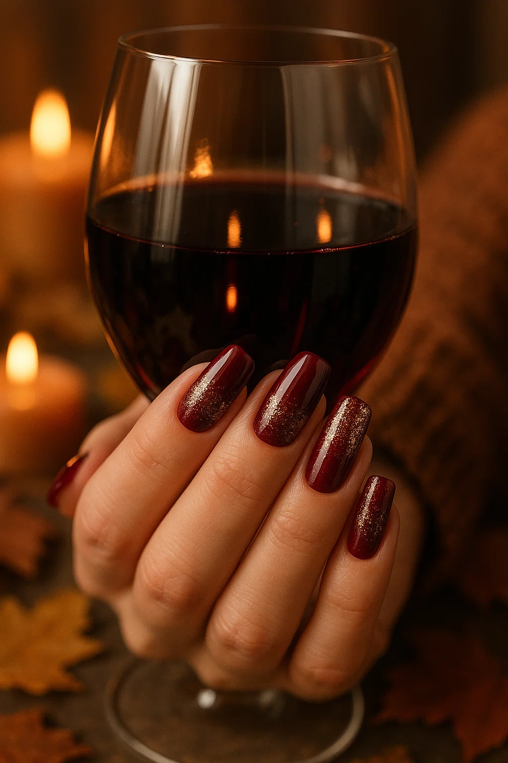 Deep burgundy with glitter is the definition of cozy sophistication — think candlelight, wine, and soft sweaters.