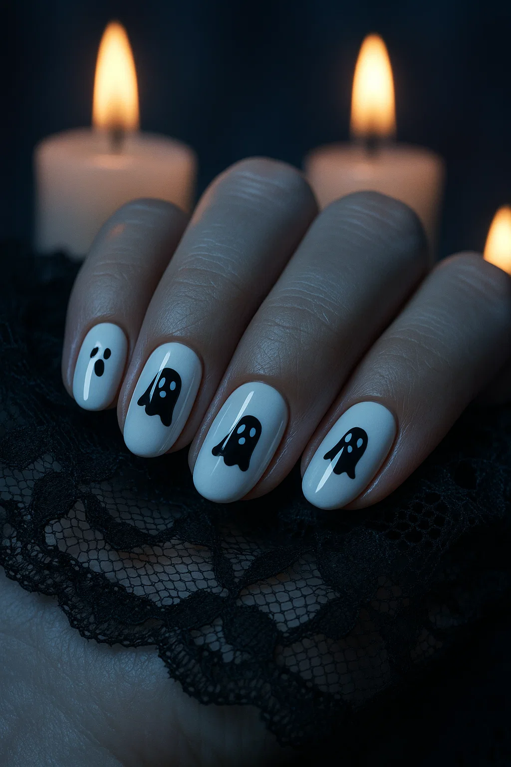 Soft white nails bring a clean, ethereal charm to Halloween. Perfect for a subtle yet haunting manicure.
