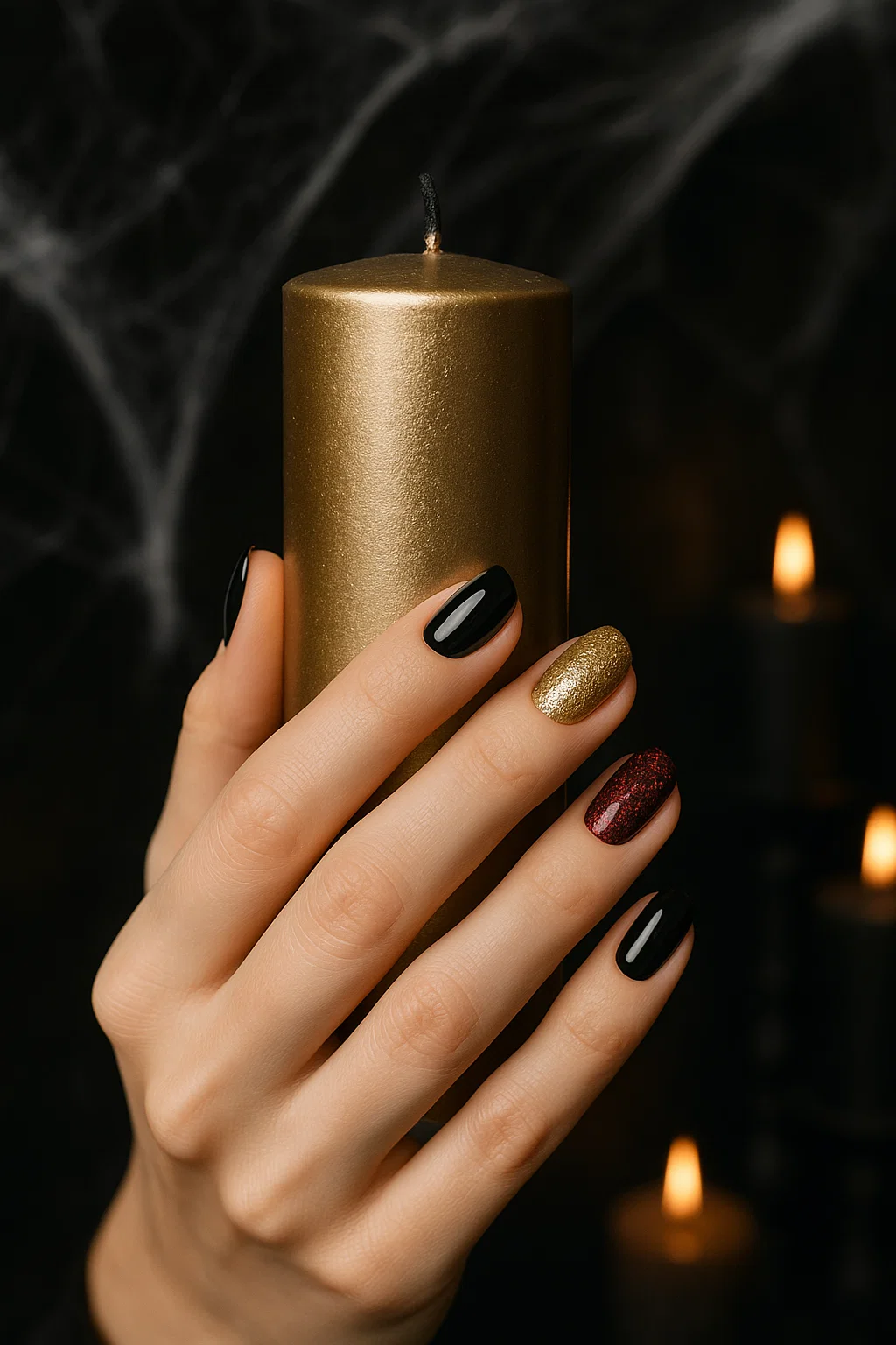9️⃣ Black & Gold Mix – Luxe Halloween Energy