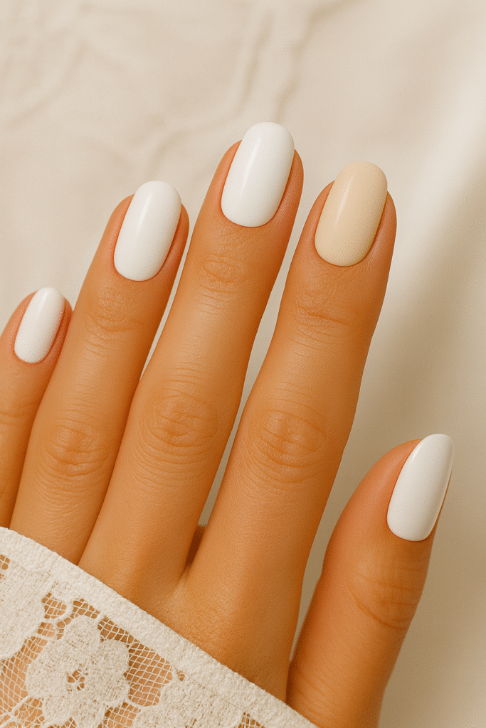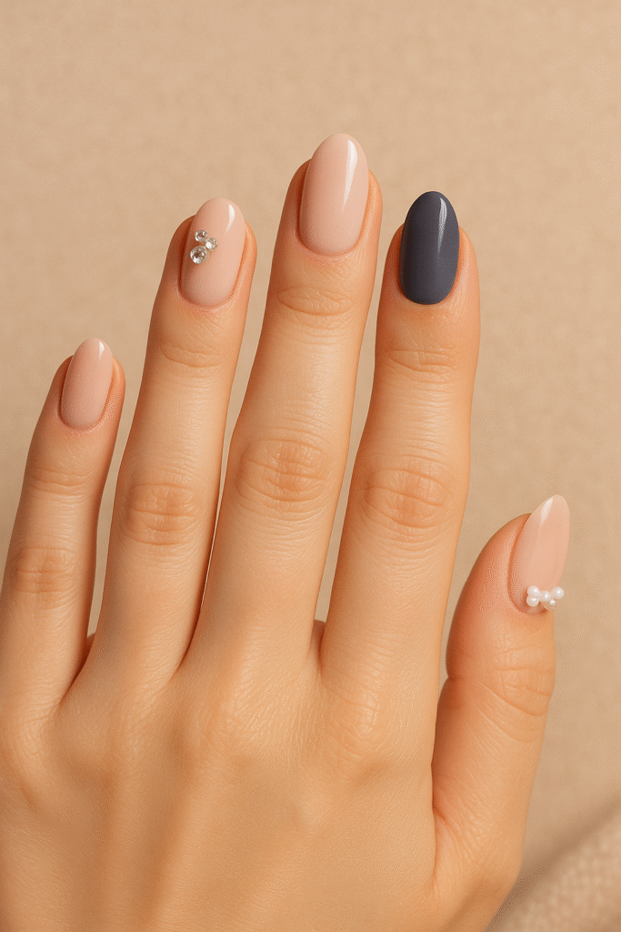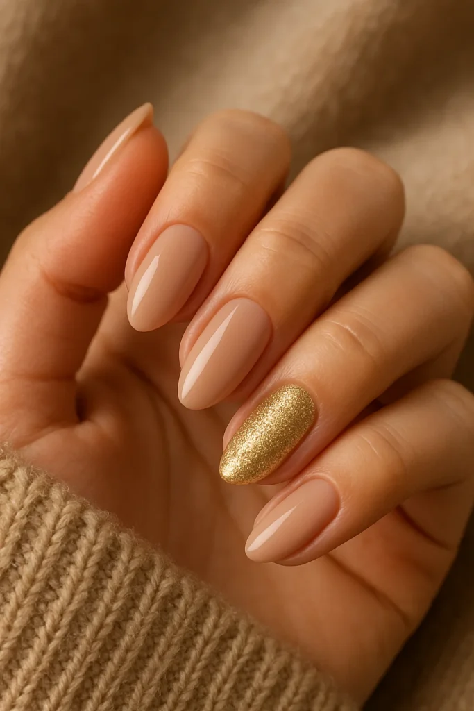 Warm Nude with Gold Accent: Neutral nude base features single gold accent nail (typically ring finger).