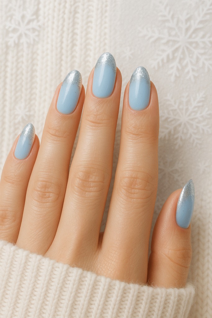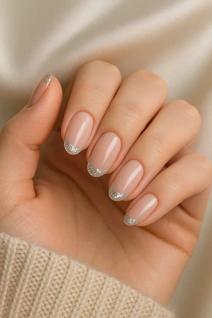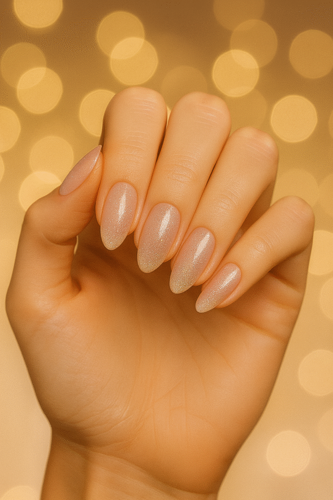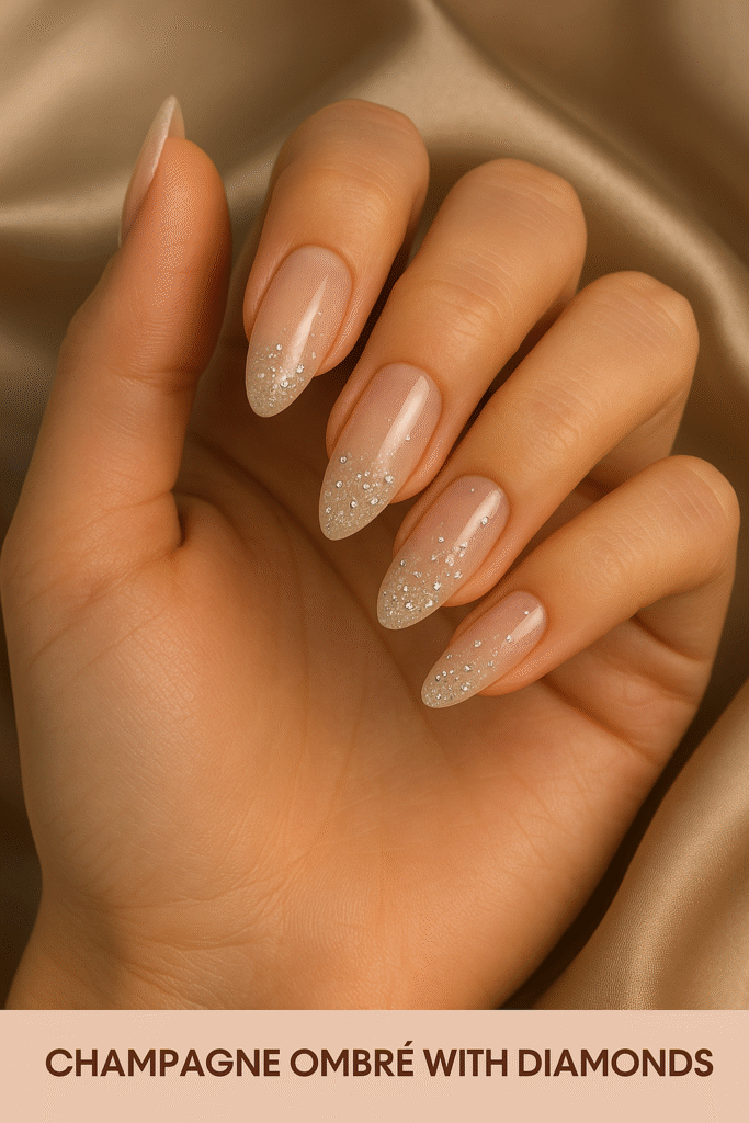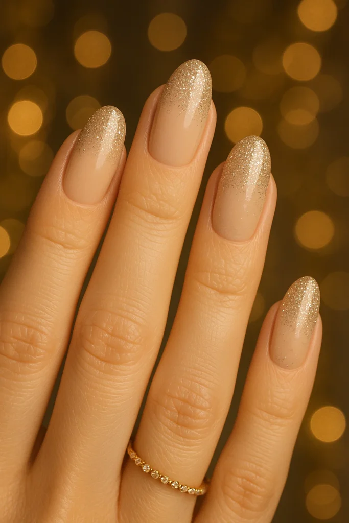 Champagne Glitter Ombré: Nude base transitions to champagne glitter at the tips, creating a sophisticated sparkle.