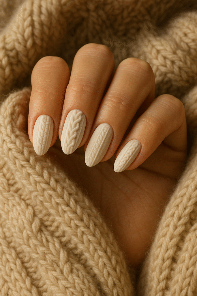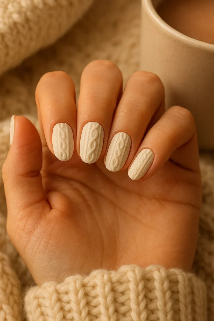 Cream Cable-Knit Texture: Raised cream-colored polish creates the illusion of knitted fabric on your nails.