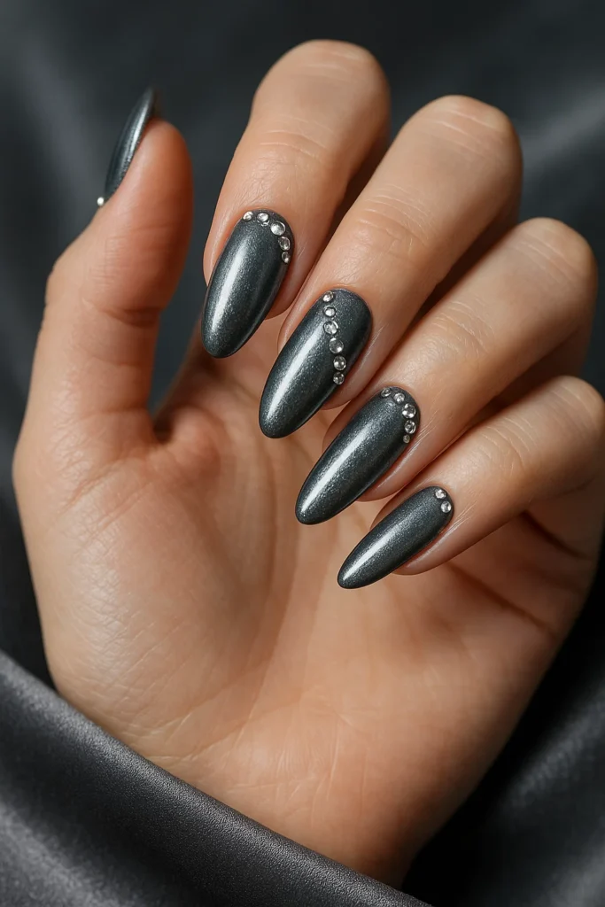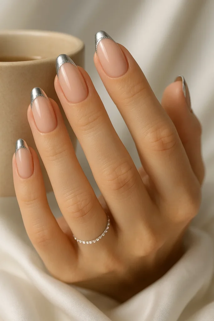 Silver French with Rhinestones: Classic French manicure gets winter elevation through silver metallic tips and tiny rhinestones along the smile line.