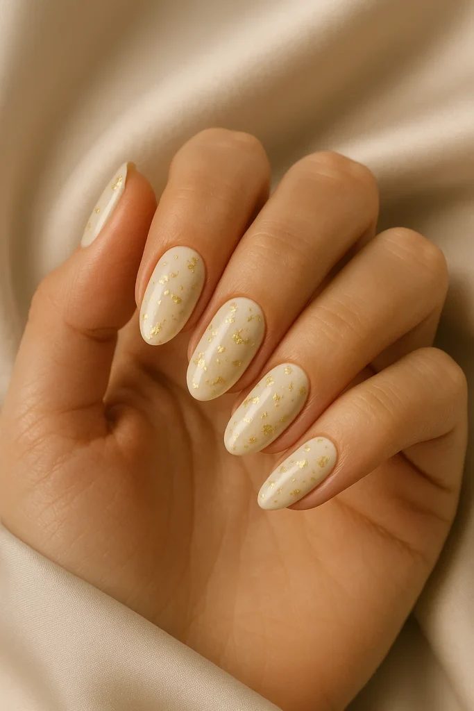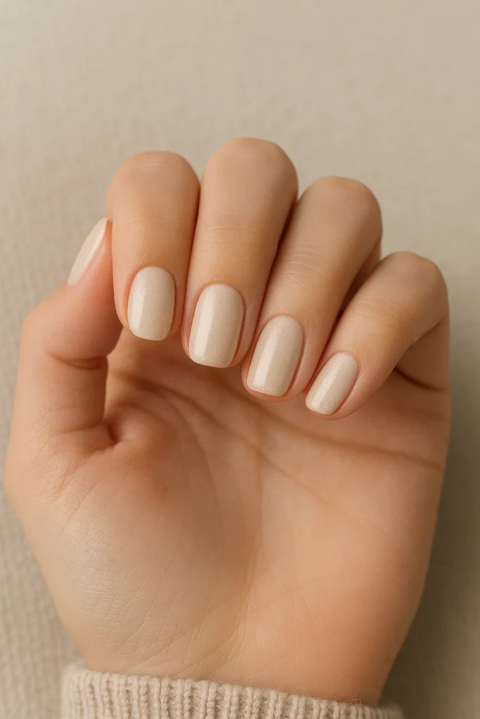 Oatmeal Squoval with Subtle Shimmer: Creamy oatmeal shade with fine shimmer particles catches light gently.
