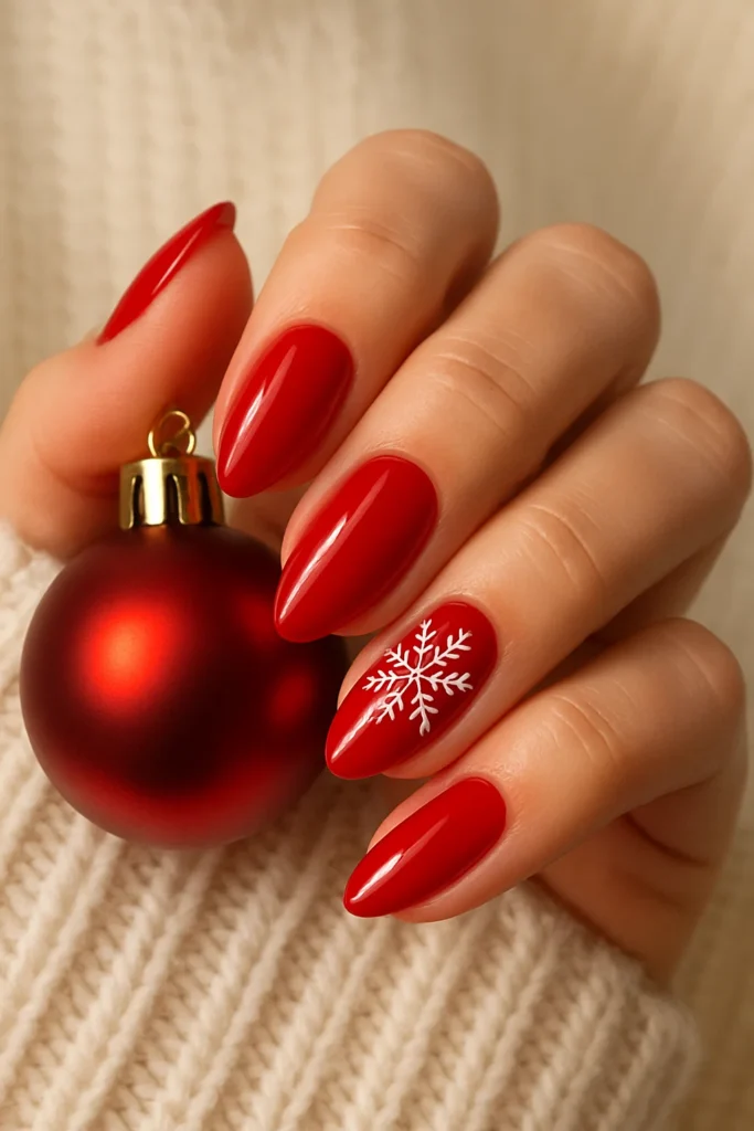 Classic Red with White Snowflakes: Timeless red (Essie’s “Really Red”) gains winter character through white snowflake decals.
