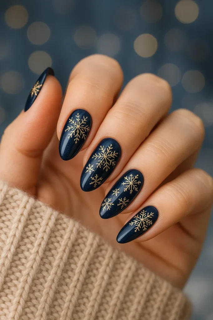 Gold Snowflakes on Navy: Midnight navy base (Essie’s “Midnight Cami”) provides contrast for delicate gold snowflake patterns.