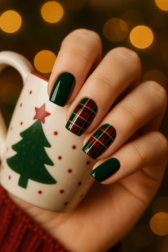 Green Plaid Accent: Classic holiday plaid appears on accent nails using deep forest green, burgundy, and gold striping.