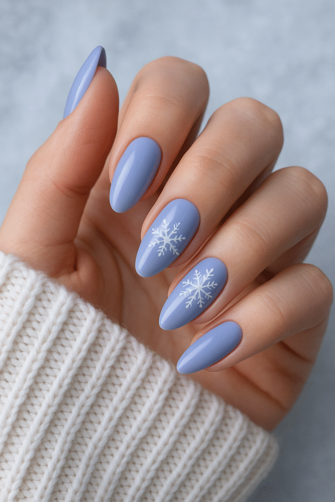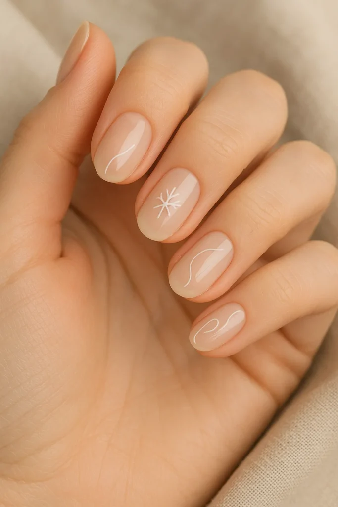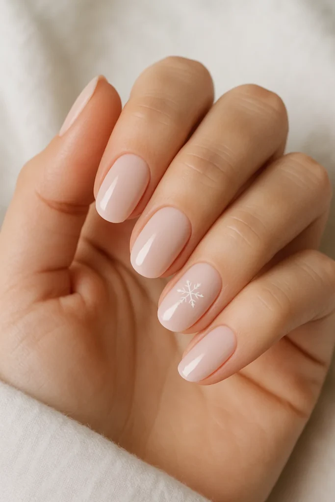 Soft Pink with Single Snowflake: Pale blush pink base features one delicate snowflake on the ring finger.