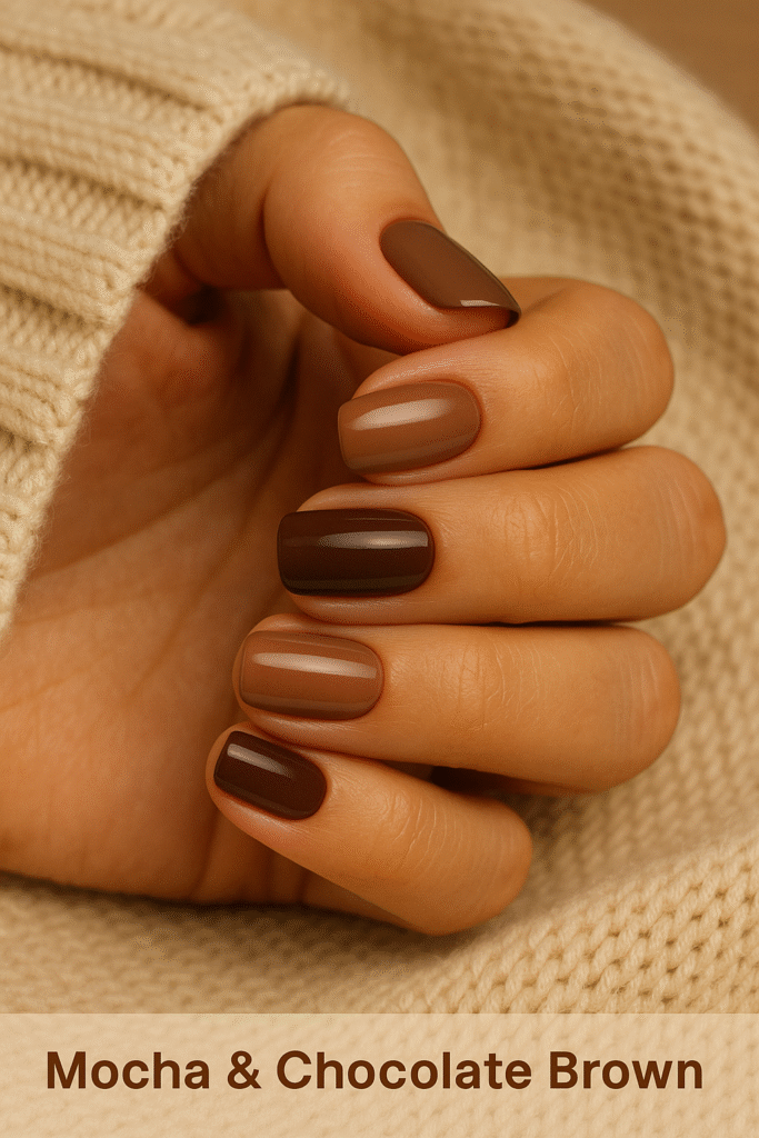 Difficulty: Beginner. OPI’s “Chocolate Moose” or Essie’s “Hot Coco” work beautifully. Two coats plus matte top coat complete the look in 30 minutes.