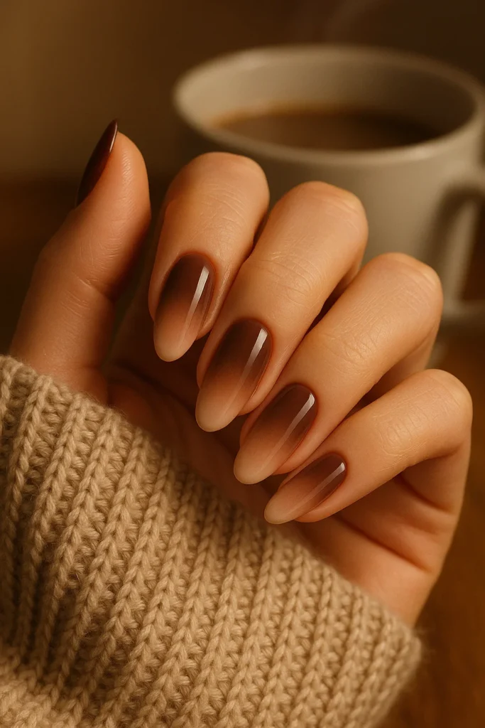 Mocha Latte Ombré: Warm brown gradient flows from deep mocha at the cuticle to creamy latte at tips.