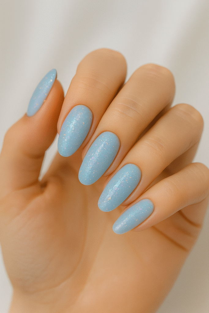 Use OPI’s “Bubble Bath” base with Essie’s “Penny Talk” glitter. Application time: 40 minutes.