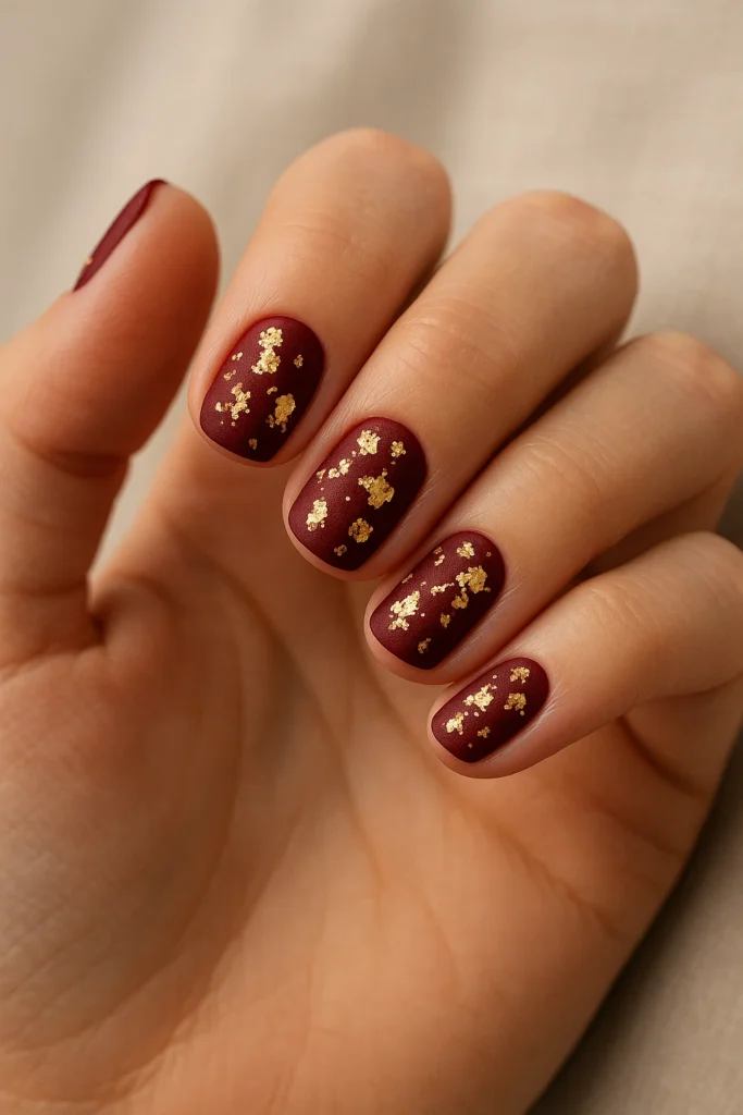 The matte red polish (like Essie’s Bordeaux) creates depth, while random gold placement keeps the design organic. Difficulty: Beginner-Intermediate.
