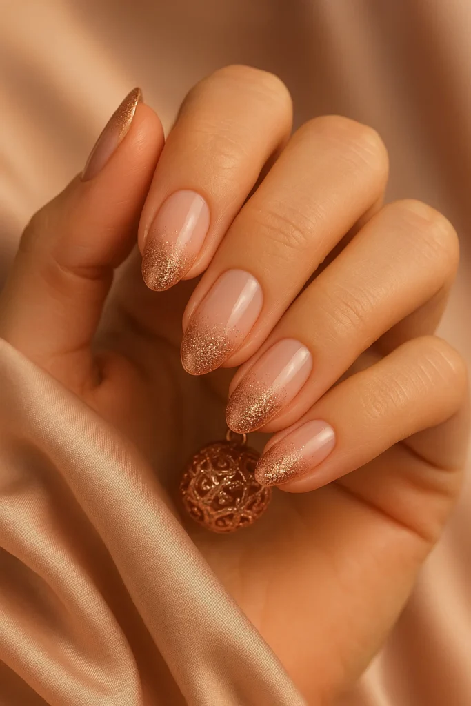 Rose Gold Glitter Gradient: Warm rose gold glitter fades from tips on a soft pink base, creating romantic holiday sparkle.
