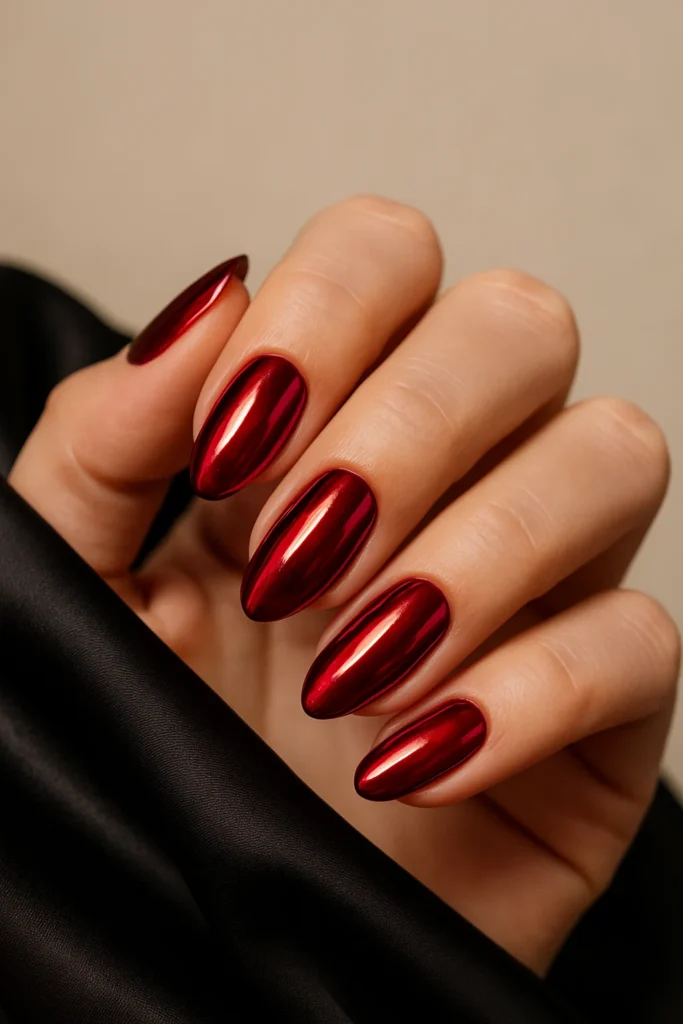 Sally Hansen’s “Red My Lips” creates the base, while Born Pretty chrome powder (red/gold shift) adds dimension.