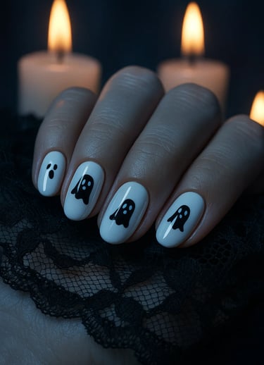 Soft white nails bring a clean, ethereal charm to Halloween. Perfect for a subtle yet haunting manicure.