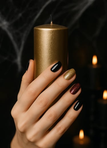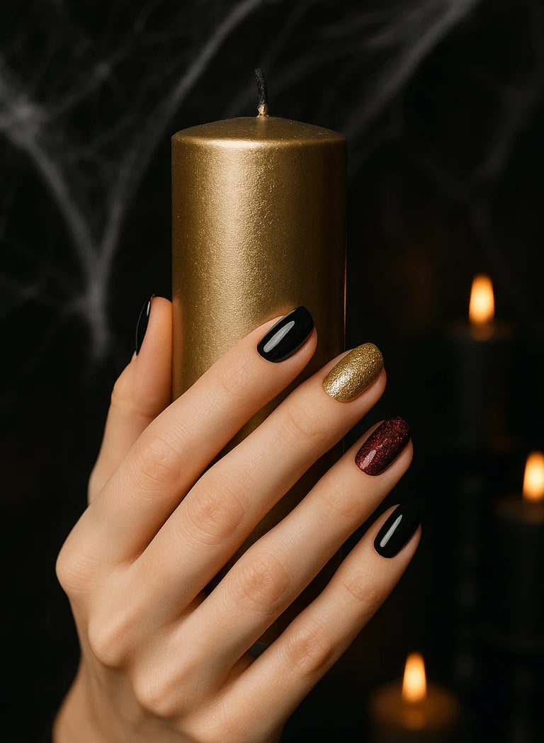 9️⃣ Black & Gold Mix – Luxe Halloween Energy
