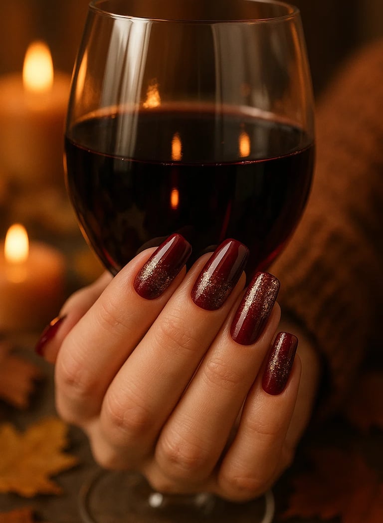 Deep burgundy with glitter is the definition of cozy sophistication — think candlelight, wine, and soft sweaters.